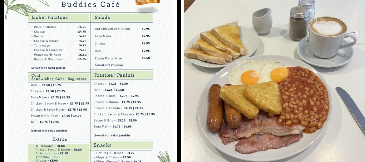 Discover Buddies Café in Wigston, a family-run gem under new management! Enjoy a cozy atmosphere with delicious hot and cold food, great coffee, and delightful desserts. Whether you’re stopping by for breakfast, lunch, or a quick takeout, we have something for everyone. Enjoy our outdoor seating, vegetarian options, and family-friendly amenities. Join us today for an unforgettable dining experience!